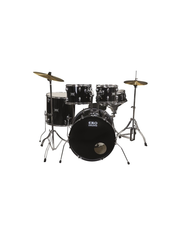 La batteria acustica ED-200 è un set composto da 5 pezzi: Grancassa 16" x 10", Tom 8" x 5", Tom 10" x 6", Timpano 12" x 10" e Rullante 10” x 5” con rivestimento in finitura color Black. Pelle Grancassa Risonante Bianca con Logo EKO DRUMS Nero.